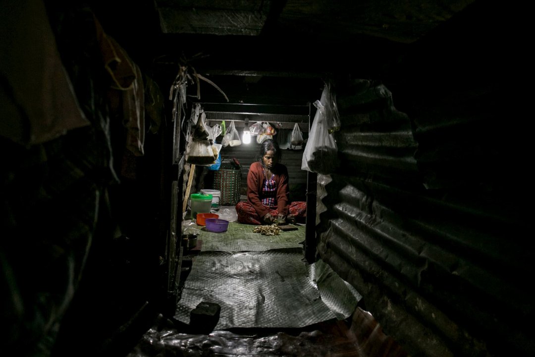 Photographs in Below Three Feet (2019) by Kaung Swan Thar depict deplorable living conditions of low-income workers and their families living in ten-feet-wide, three-feet-high rooms under the staircase of rented houses located next to the Yangon Railway Station. The rooms have only one entrance and no windows. Tenants have to grovel and crouch in these dark small shelters. Despite their predicaments, they do not want to move out as it is convenient for them to find daily jobs in the area. According to Kaung Swan Thar, he was shocked when he stepped into the place as he has never imagined there are people living under such conditions in the downtown Yangon.